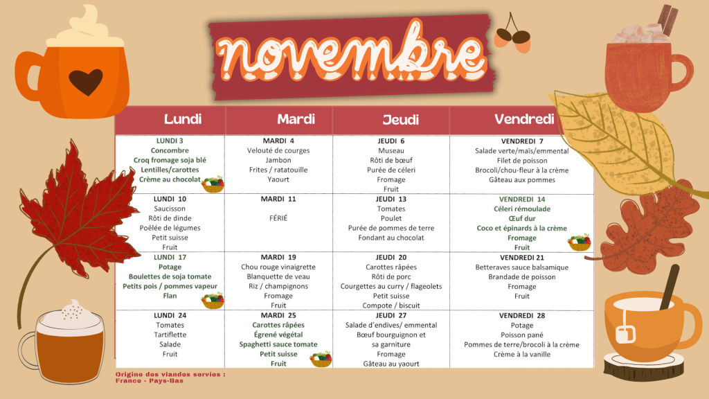 (les menus sont donnés pour le mois suivant)