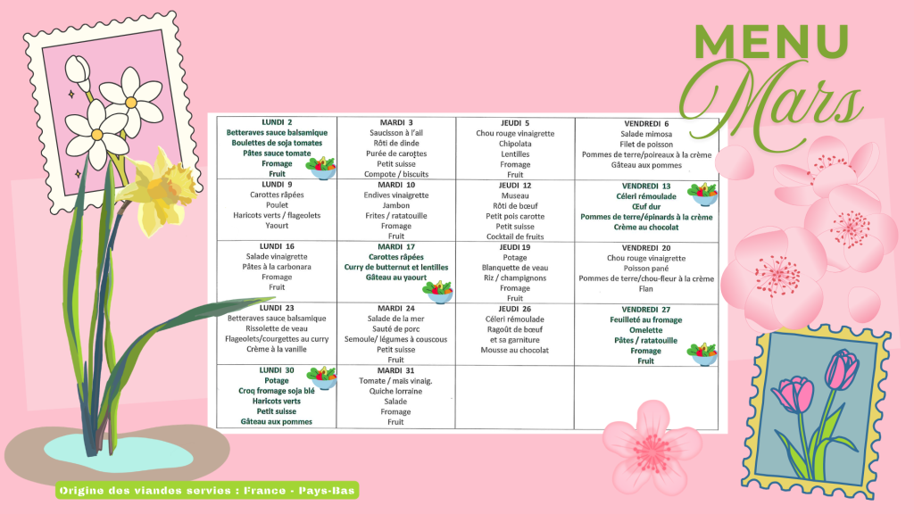 - Pour connaître l'origine des viandes, adressez-vous en mairie.